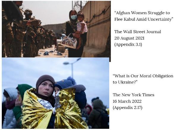 Even when comparing similar images, headlines could influence perception of the issues. Among several photos of mother and child, only one featured an Afghan woman and child. The headline reads: ‘Afghan Women Struggle to Flee Kabul Amid Uncertainty’, surrounded by soldiers, creating its own visual imagery. By comparison, a similar photo of a Ukrainian mother and child reads ‘What is Our Moral Obligation to Ukraine?’, directly implicating the reader to take action.